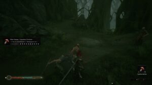 Et les combats dans tout ça ? Le gameplay proposé, est, comparé aux autres titres du genre, très similaire, il faut esquiver, frapper, encore esquiver , etc… Une lourdeur qui manque de fun et qui ne plaira clairement pas aux joueurs plus bourrin, la sentence étant immanquablement la mort pour recommencer les combats. Deux touches permettent dans lancer un combo rapide ou un combo lourd (profitant des gâchettes adaptives de la PS5) et une touche d’esquive qui use de votre endurance pour faire des roulades ou éviter les attaques ennemies. Une touche vous permettra également d’appliqué un spécificité de votre personnage, l’endurcissement, qui ce recharge dans un laps de temps défini, vous rendant quasi invulnérable et ébranlant l’attaque de l’ennemi, vous permettant d’assené au retour quelques coups. Sur PS5 la touche profitant de la gâchette adaptive pour vous indiquer que l’endurcissement n’est pas encore disponible.